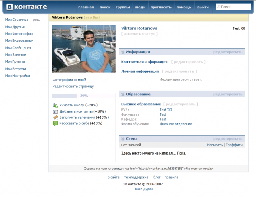 All features are standard: friends, photos, videos, messages, notes (blog), groups, and events. There is support for Russian declinations, including gender-specific inflection with support for names, which is quite difficult to implement, for example: Друзья Наталии Искорки (Friends of Nataly Iskorka).
